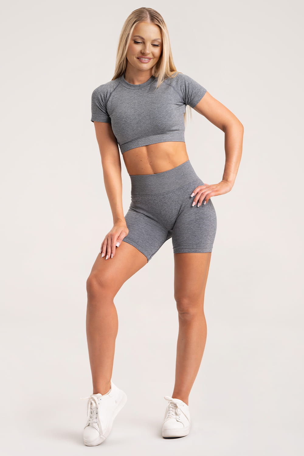 Nahtlose Shorts in Stahlgrau.
