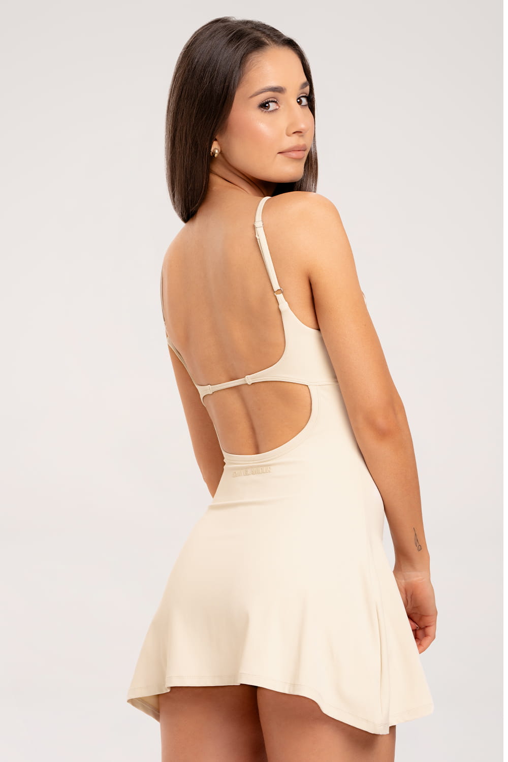 Doppellagiges Minikleid mit elegantem Schlitz, das femininen Stil mit Funktionalität verbindet. Die innere Schicht ist ein bequemer Body mit Beinen, der für Komfort und Bewegungsfreiheit sorgt. Integrierter BH mit herausnehmbaren, konturierten Cups formt sanft die Brust. Durch verstellbare Träger wird das Kleid an die Figur angepasst und der tiefe Ausschnitt am Rücken verleiht ihm einen sinnlichen Charakter. Das Ganze ist mit einem dezenten, glänzenden Logo verziert, das auf der unteren Rückenpartie angebracht ist.
