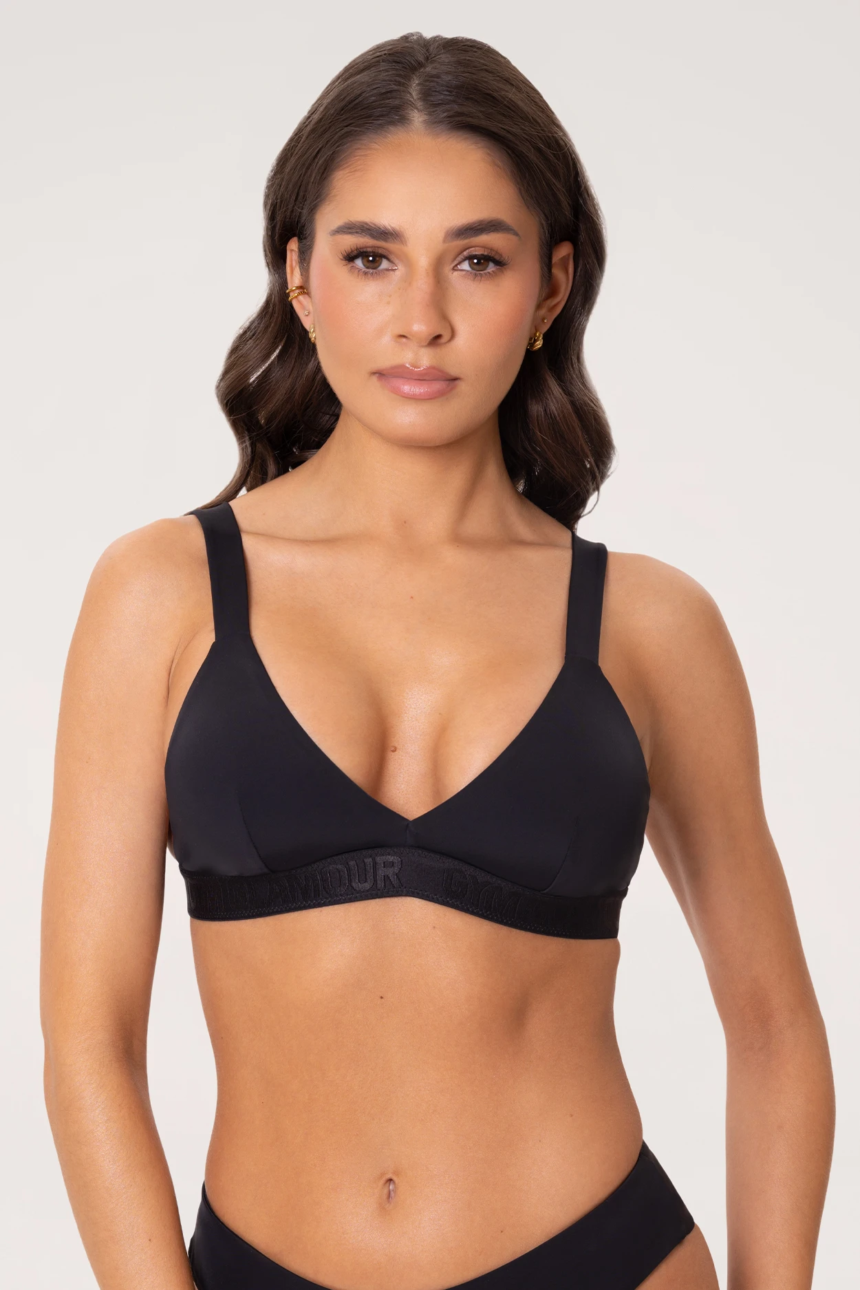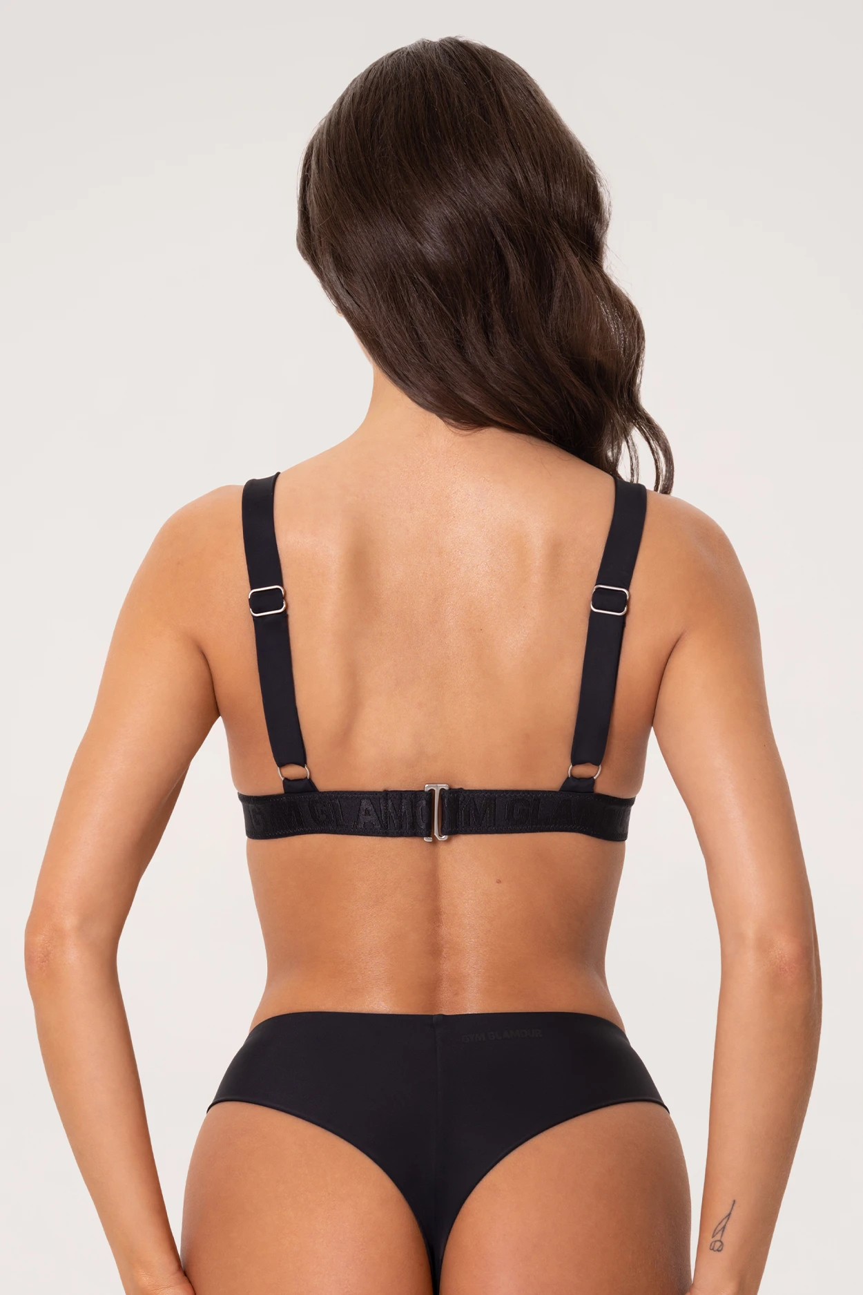 - Das monochrome Gym Glamour-Logo befindet sich auf einem elastischen Unterbrustband mit Rückenverschluss. Dank des verstellbaren Bandes sitzt das Oberteil perfekt.