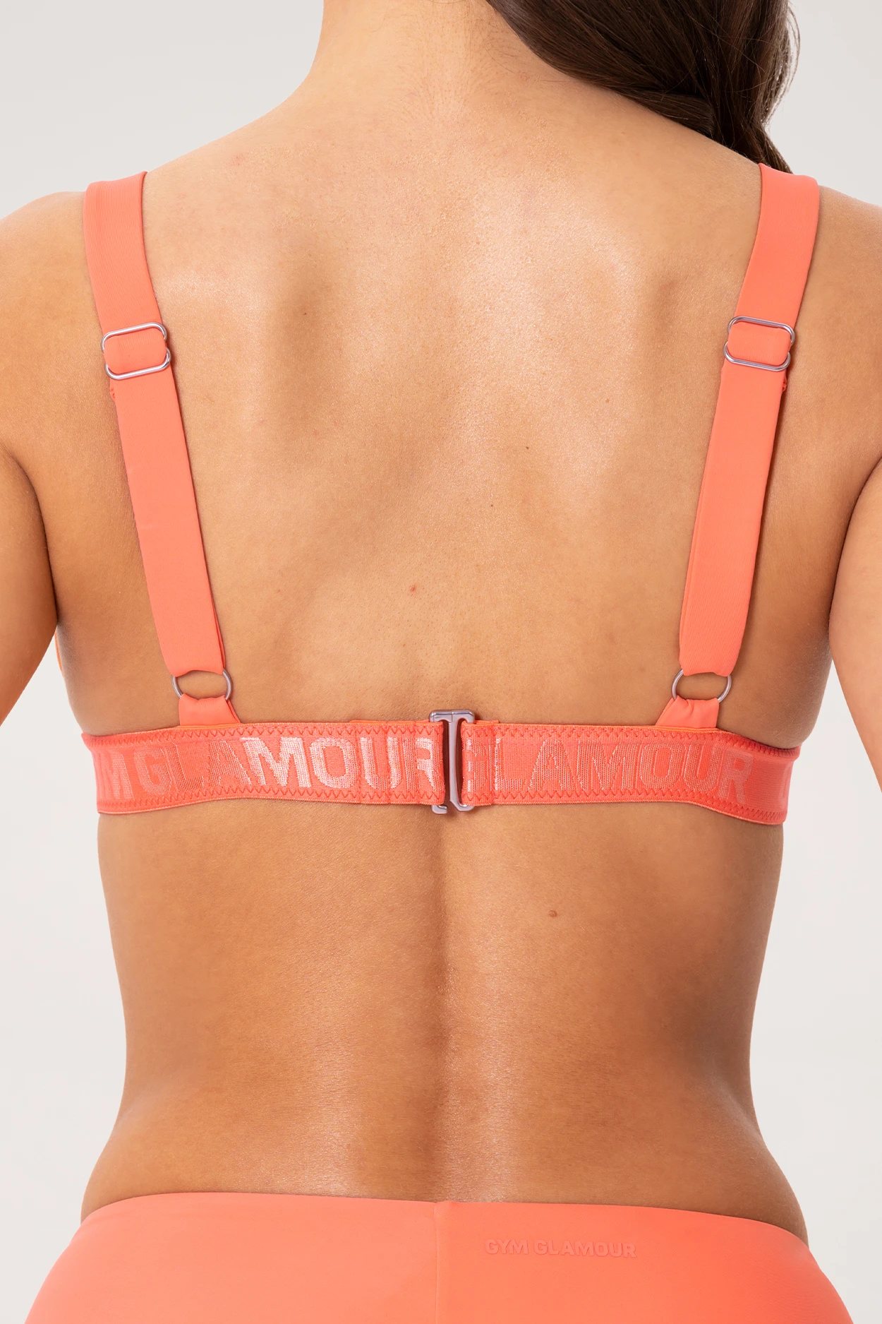 - Das monochrome Gym Glamour-Logo befindet sich auf einem elastischen Unterbrustband mit Rückenverschluss. Dank des verstellbaren Bandes sitzt das Oberteil perfekt.
